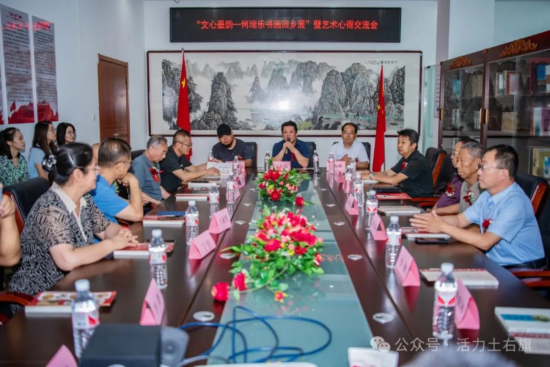 书画展开幕式当天,来自全国及周边城市的书画名家和文艺界人士与土右旗当地的艺术家们一起参观,一起座谈。大家从何瑞乐的作品出发,谈及土右旗文化艺术发展和包头市打造文化高地等话题,专家们提出了很多宝贵的意见。