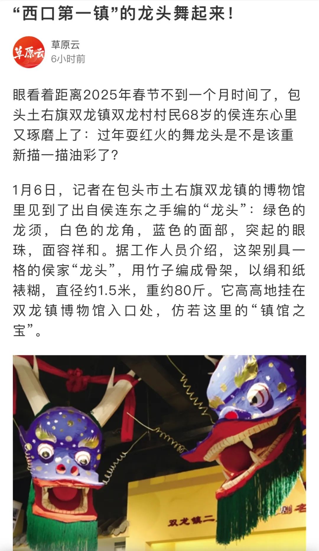 眼看着距离2025年春节不到一个月时间了,包头土右旗双龙镇双龙村村民68岁的侯连东心里又琢磨上了:过年耍红火的舞龙头是不是该重新描一描油彩了?