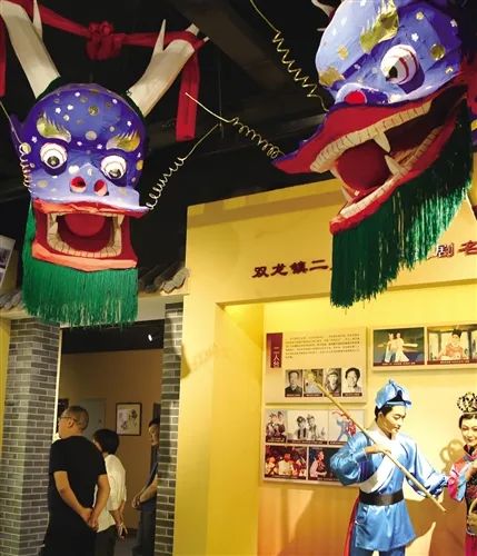 “在荒旱无雨寸草不生的土地上,壮汉头冠柳枝、臂插双刀,村民以牛羊牲品跪拜祈雨……”伴随着讲解员的解说,双龙博物馆内的灯光忽然暗了下来。紧接着,一阵轰隆隆的雷声过后,两道金光笔直地射入投影出来的两个水泡中,两个水泡中驻有一条青龙,一条红龙,“自此雨露滋润、田禾复生,村名遂更为‘双龙’”。这个流传当地的动人传说,寄托了乡民们祈盼风调雨顺、五谷丰登的美好心愿。