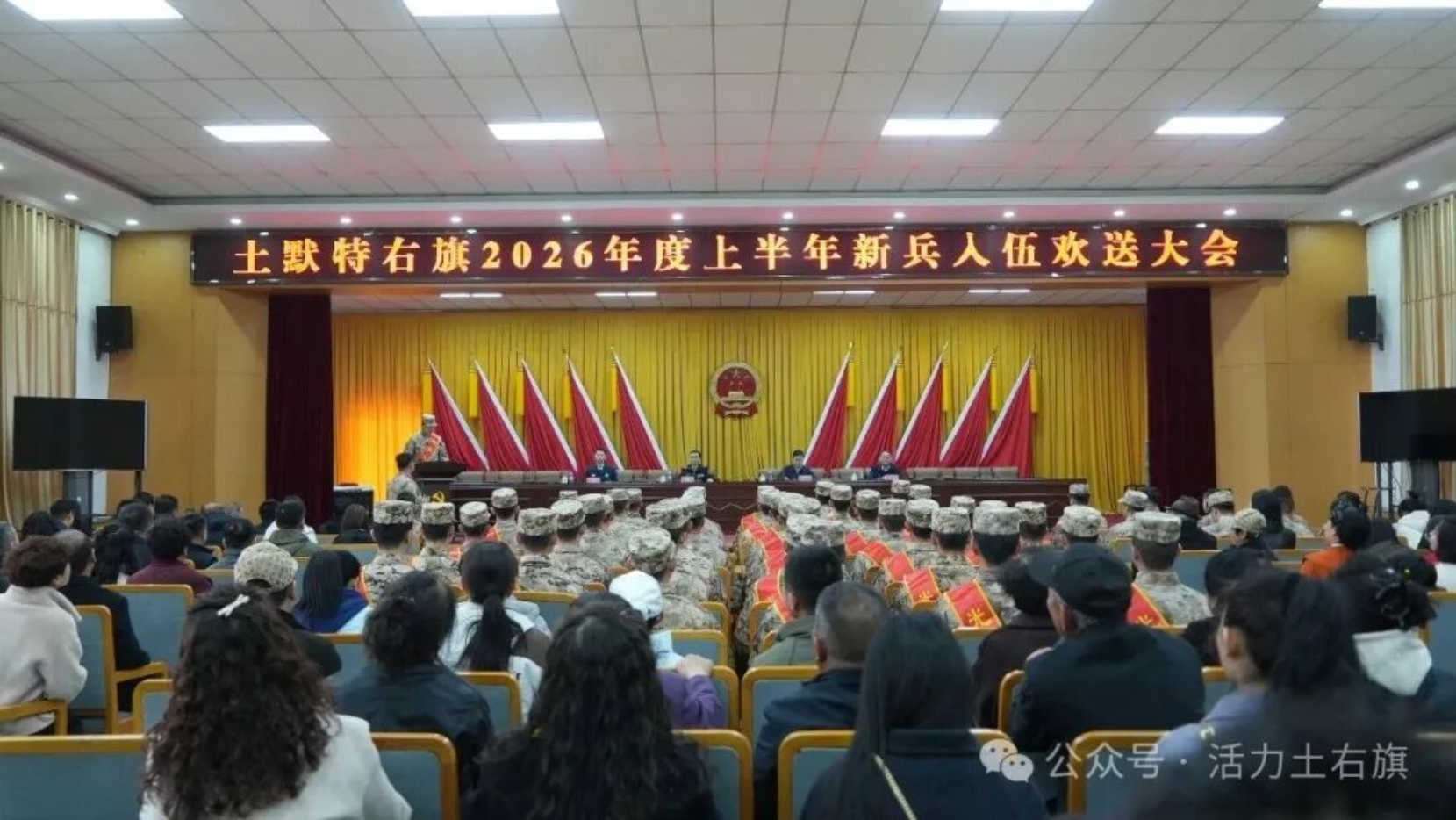 3月15日,土右旗2026年春季新兵入伍欢送大会在旗政府会议厅举行。新兵们身着戎装、胸戴红花,军容严整、精神抖擞,怀揣着保家卫国的信念即将奔赴军营。