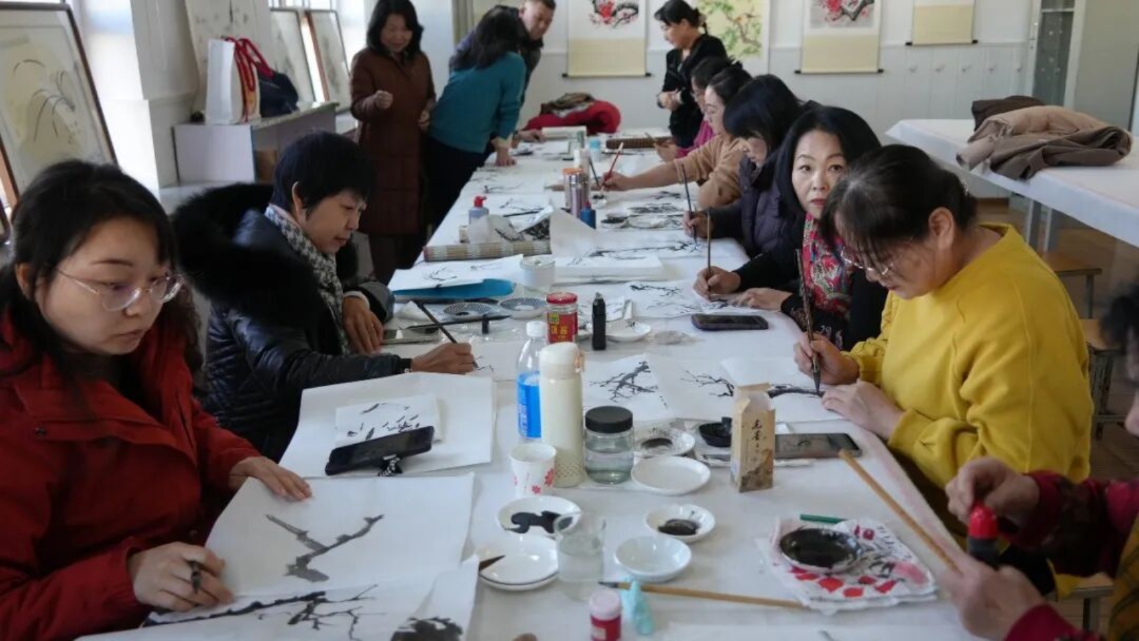 走进宽敞明亮的绘画教室,开班第一课正热闹开讲。今年58岁的温彩凤是绘画班的新学员,她拿着画笔,在画纸上小心翼翼地勾勒着梅花的轮廓。