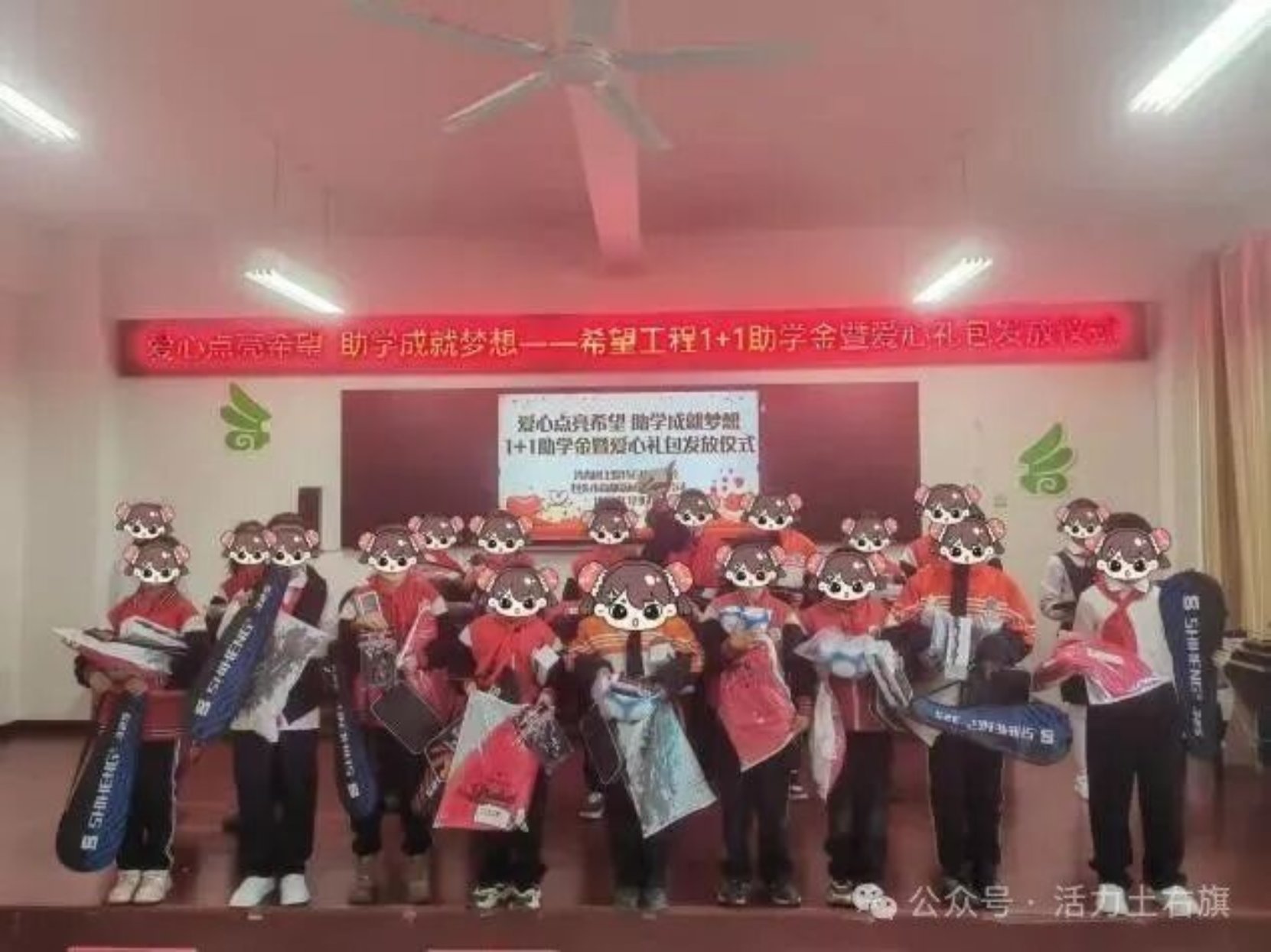 爱心企业代表在现场发言时表示,企业始终将社会责任铭记于心,此次助学行动旨在为孩子们的成长之路保驾护航,助力他们逐梦前行。发言结束后,爱心企业代表为受助学生代表发放爱心礼包;共青团土默特右旗委员会相关人员则为受助学生代表发放希望工程1+1助学金,孩子们双手接过物资,脸上洋溢着幸福灿烂的笑容。