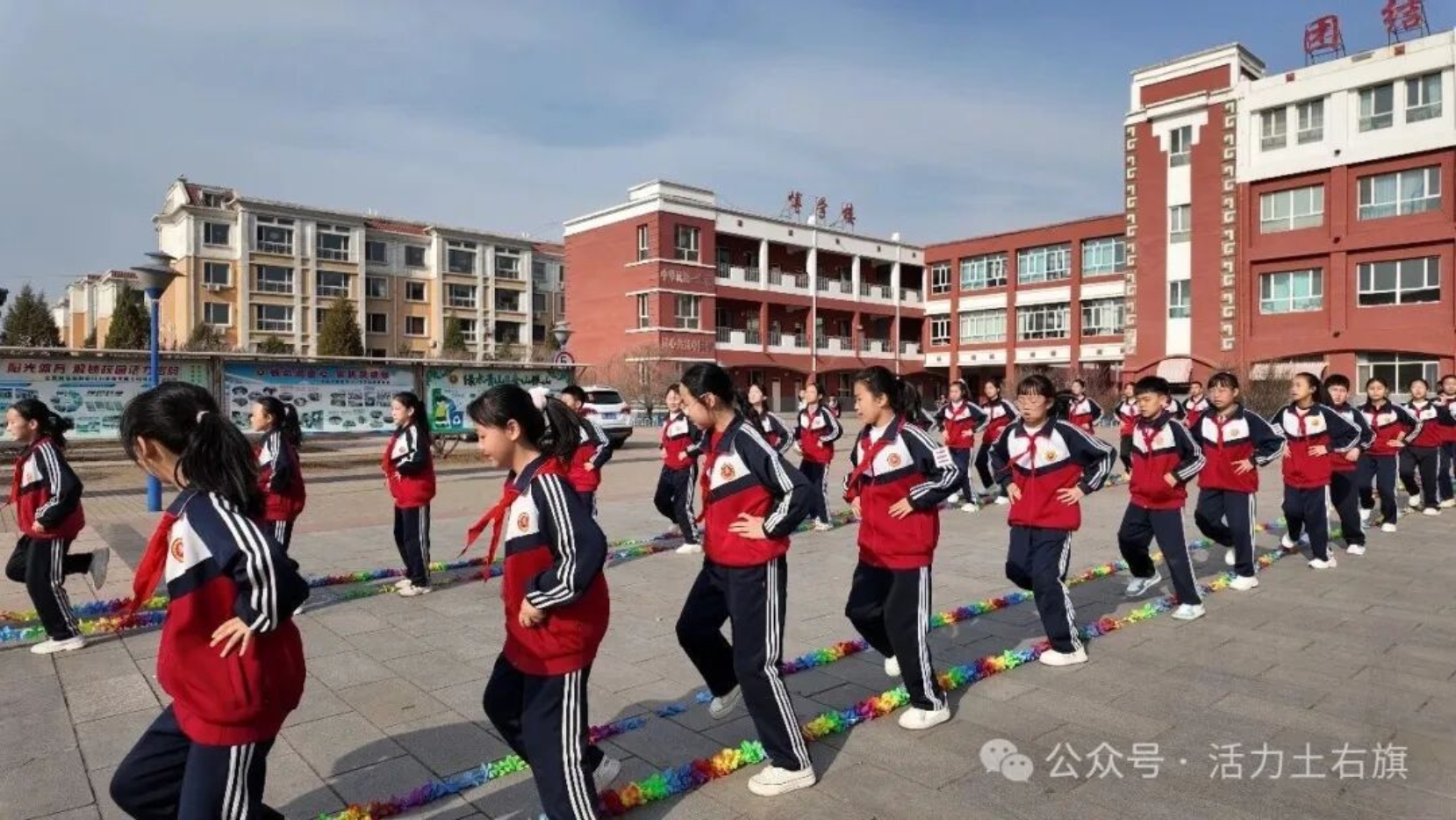 如果说研学之旅是“行走的思政课”,那么校园里的趣味活动则是“跳动的思政课”。敕勒川小学大胆创新思政教育形式,将红色文化、爱国主义教育与传统体育活动跳皮筋巧妙结合,打造独具特色的校园思政课间。孩子们伴着“爱祖国、心向党,民族团结一家亲”的朗朗歌谣,欢快跳跃、灵动穿梭,在轻松有趣的运动中,红色基因悄然浸润稚嫩心田,中华民族共同体意识深深扎根。